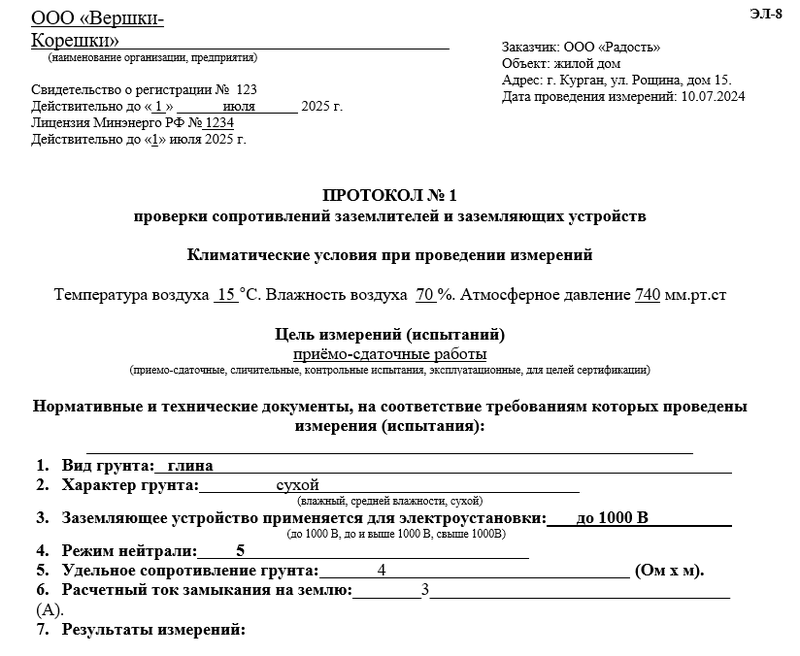 • Результаты измерений сопротивления заземления. В акте должны быть представлены результаты измерений сопротивления заземления, выполненные в соответствии с требованиями нормативных документов;