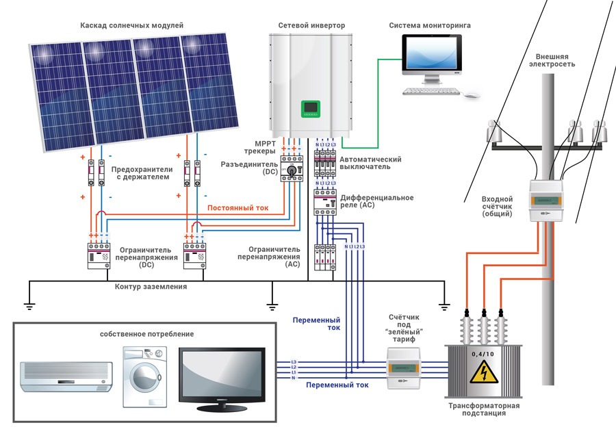 Система солнечных батарей, подключенная к сети, состоит из нескольких ключевых компонентов⁚