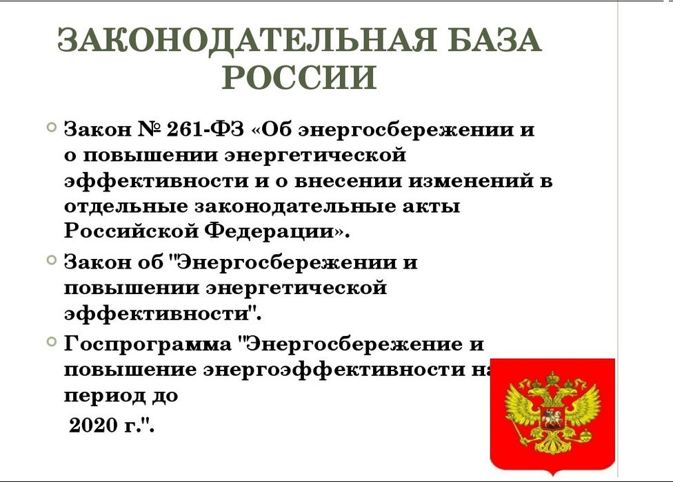 Эти основные положения закона обеспечивают комплексный подход к решению проблем энергосбережения и повышения энергоэффективности в России․